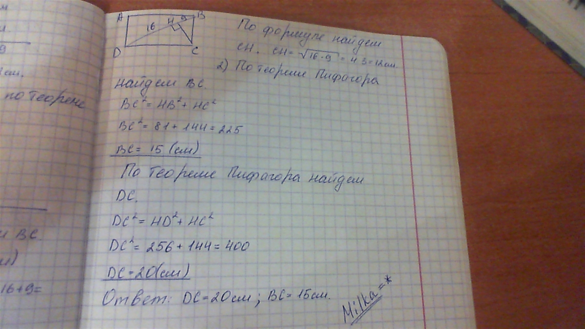 Из вершины прямоугольника на диагональ опущен перпендикуляр который делит её на отрезки 9см и 16 см Найти стороны прямоугольника