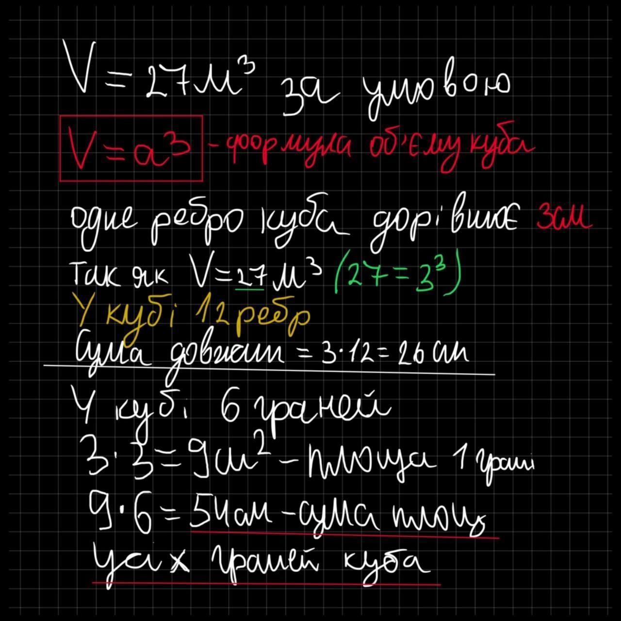 сума довжин 26,сума площ всех граней 54