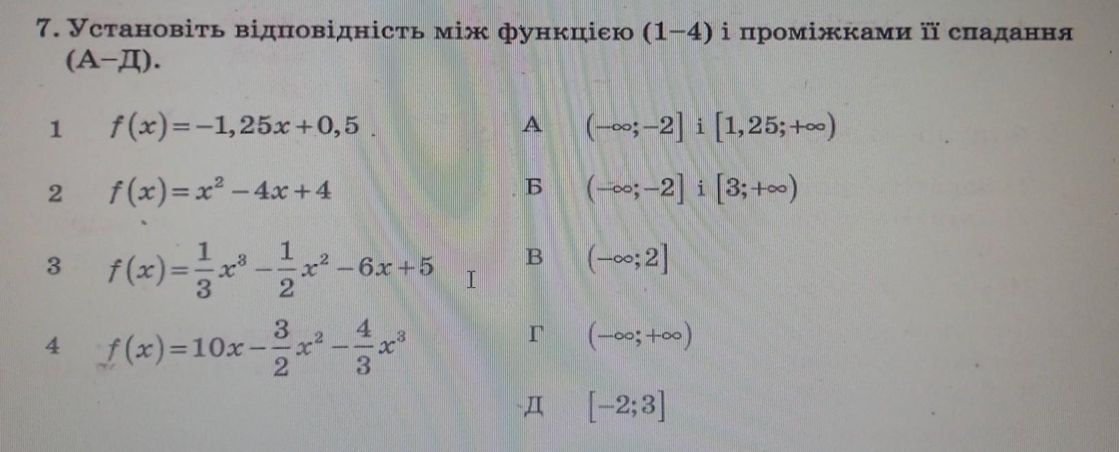 Установить соответствие между функциями (1 - 4) и промежутками их убывания (А - Д)