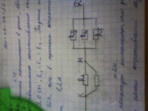 Определить напряжение в цепи,общий ток и эквивалентное сопротивление,если R1=R2=20 Ом,R3=R4=R5.Падение напряжения U3=72В,ток в третьем сопротивлении равен 1,2А.