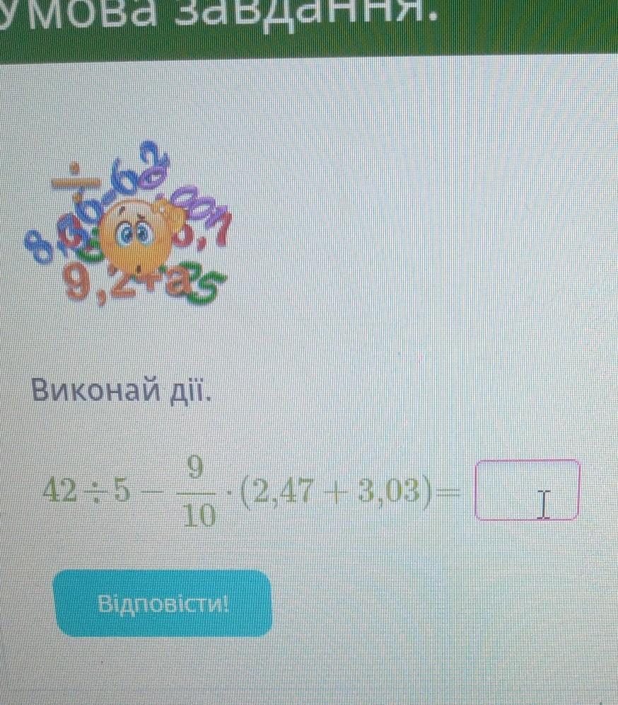 42:5-9/10*(2,47+3,03)=42:5-9/10*5,5=8,4-9/10*5,5=8,4-4,95=3,45