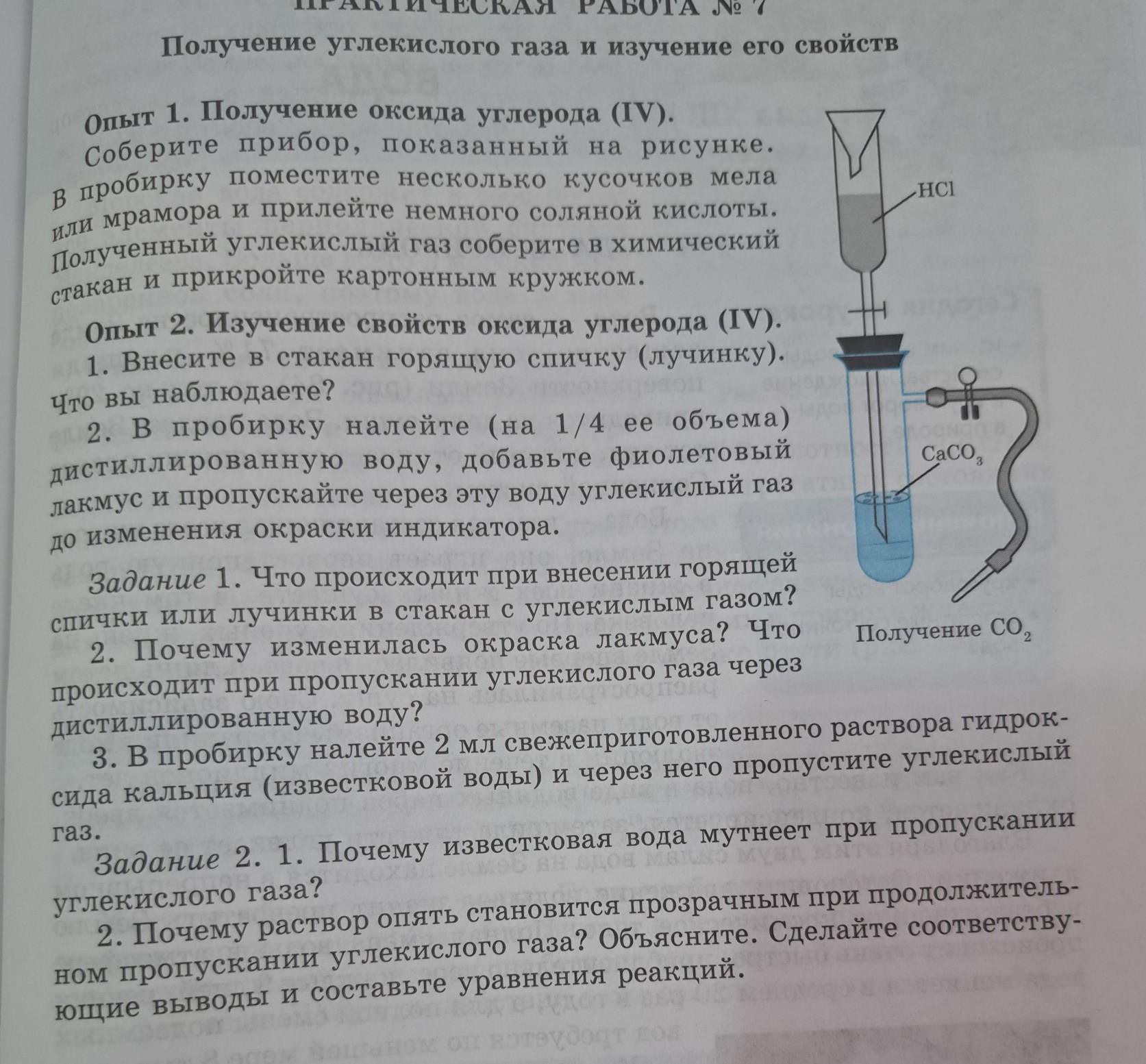 Опыт 1. Получение оксида углерода (IV). Соберите прибор, показанный на рисунке. в пробирку поместите несколько кусочков мела или мрамора и прилейте немного соляной кислоты. Полученный углекислый газ соберите в химический стакан и прикройте картонным кружком. Опыт 2. Изучение свойств оксида углерода (IV). 1. Внесите в стакан горящую спичку (лучинку). Что вы наблюдаете? 2. В пробирку налейте (на 1/4 ее объема) дистиллированную воду, добавьте фиолетовый лакмус и пропускайте через эту воду углекислый газ до изменения окраски индикатора. HCI LOCNET 3 CaCO, Задание 1. Что происходит при внесении горящей спички или лучинки в стакан с углекислым газом? 2. Почему изменилась окраска лакмуса? Что происходит при пропускании углекислого газа через дистиллированную воду? 3. В пробирку налейте 2 мл свежеприготовленного раствора гидрок- сида кальция (известковой воды) и через него пропустите углекислый газ. Получение Со, Задание 2. 1. Почему известковая вода мутнеет при пропускании углекислого газа? 2. Почему раствор опять становится прозрачным при продолжитель- ном пропускании углекислого газа? Объясните. Сделайте соответству- ющие выводы и составьте уравнения реакций.
