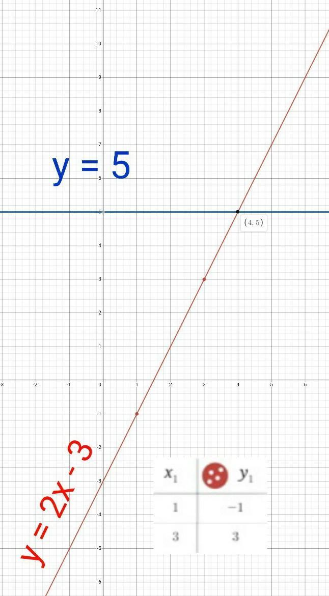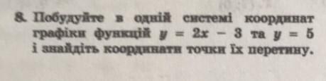 - Побудуйте в одній системі координат графікн функцій у = 2х - 3 та у = 5 у і знайдіть координати точки їх перетину.