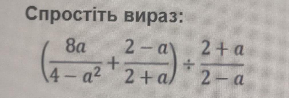 ( \frac{8a}{4 -  {a}^{2} }  +  \frac{2 - a}{2 + a} ) \div  \frac{2 + a}{2 - a}  = ( \frac{8a}{(2 - a)(2 + a)}  +  \frac{2 - a}{2 + a} )  \times  \frac{2 - a}{2 + a}  =  \\  =  \frac{8a + (2 - a) {}^{2} }{(2 - a)(2 + a)}  \times  \frac{2 - a}{2 + a}  =  \frac{8a + 4 - 4a +  {a}^{2} }{(2 + a) {}^{2} }  =  \frac{a {}^{2} + 4a + 4 }{(2 + a) {}^{2} }  =  \\  =  \frac{ {(a + 2)}^{2} }{(a + 2) {}^{2} }  = 1
