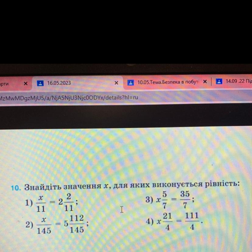 Знайдіть значення х для яких виконується рівність: 1) х/11 = 2 2/11 2) х/145 =5 112/145 3) х5/7=35/7 4) х 21/4=111/4