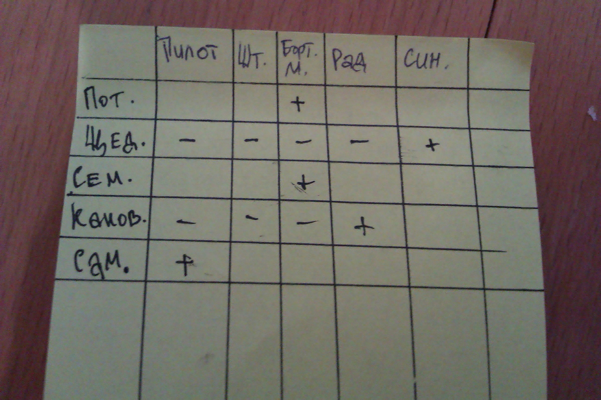 помогите решить ,ну прям ни как не догадаюсь, логическая задача : В авиационном отделении служат потапов,щедрин,семенов, канавалов ,самойлов. их специальности пилот ,штурман,борт механик,радист,синоптик. щедрин и канавалов не умеют управлять самолетом , потапов и семенов готовятся стать штурманами , щедрин и самойлов живут в одном доме с радистом , перечислите профессии каждого