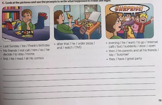Last Sunday it was Frank's birthday. His friends didn't call him so he decided to stay home. First, he read all his comics. After that, he ordered pizza and watched DVD. At evening he wanted to go to the internet café but suddenly door opened. Then his parents and all his friends said "Surprise!". They had great party.