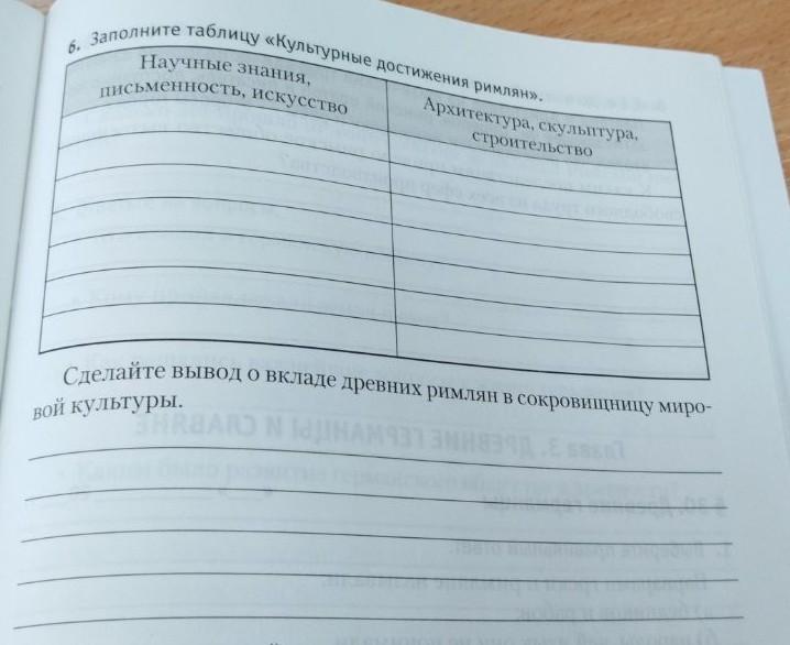 6. Заполните таблицу «Культурные достижения римлян . Научные знания, письменность, искусство Архитектура, скульптура, строительство. Извините за фото.
