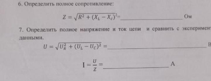 Для определения полного сопротивления и полного напряжения необходимо знать значения сопротивления, реактивного сопротивления (индуктивности и емкости) и напряжения в цепи. Также требуется уточнить, какие измерения или экспериментальные данные доступны, чтобы можно было сравнить их с рассчитанными значениями.