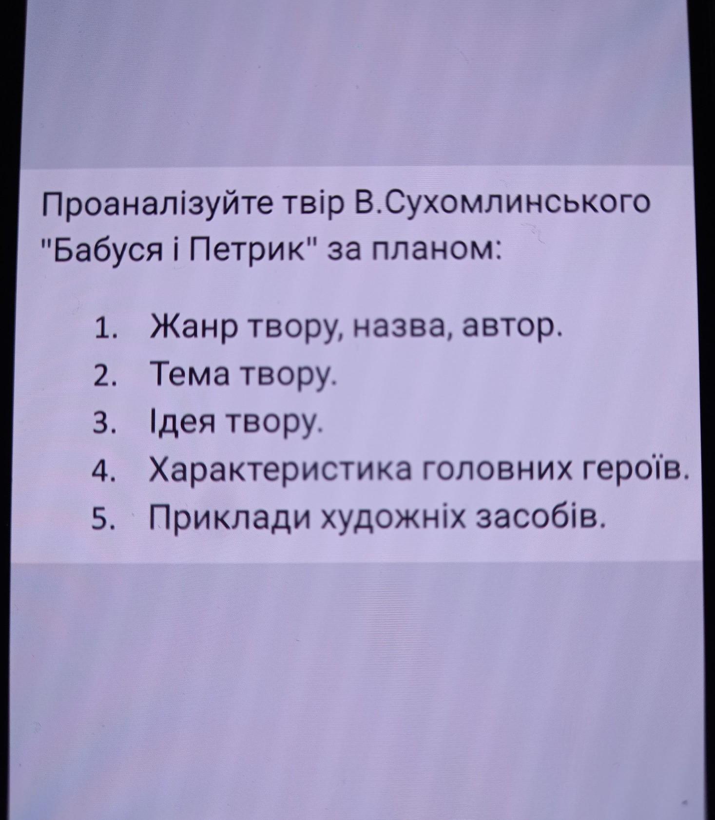 Проаналізуйте твір В.Сухомлинського "Бабуся і Петрик" за планом: 1. Жанр твору, назва, автор. 2. Тема твору. 3. Ідея твору. 4. Характеристика головних героїв. 5. Приклади художніх засобів.