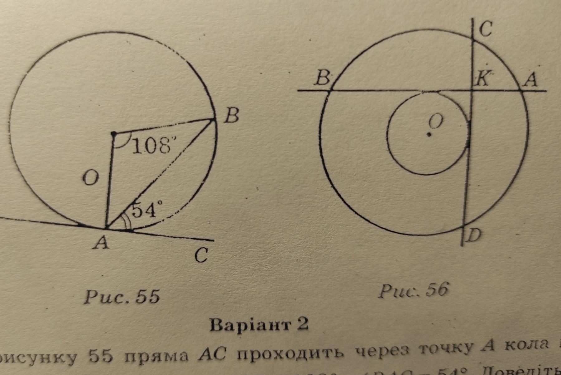 1. На рисунку 55 пряма АС проходить через точку А кола із центром О. Відомо, що ZAOB=108°, ZBAC = 54°. Доведіть, що пряма АС дотична до даного кола. 2. На рисунку 56 два кола мають спільний центр О. До меншого з них провели перпендикулярні дотичні AB і CD. Знайдіть радіус меншого кола, якщо АК = 2.см, ВК = 6 см. 3. Через точку А до кола із центром О проведено дотичні AB iAC (Bi C точки дотику). Пряма АО перетинає відрізок - ВС у точці К. Відомо, що ZBAC = 120°, АО = 40 см. Знайдіть вiдрiзок AK.