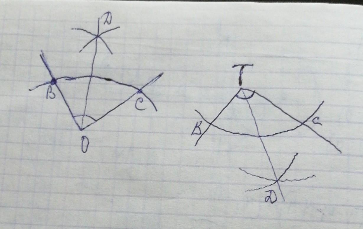 1. произвольным радиусом строим дугу окружности с центром в точке О,которая пересекает стороны угла О в точках В и С.