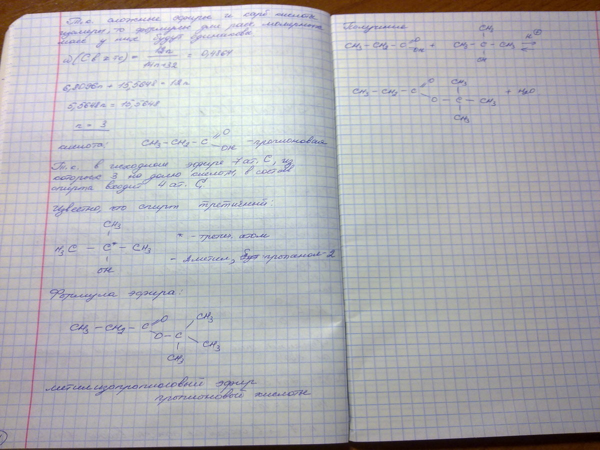 При гидролизе сложного эфира с молярной массой 130 г/моль образовались кислота и спирт . Установите структурную формулу эфира, если известно, что массовая доля углерода в полученной кислоте составляет 48,64%, а спирт является третичным. Напишите уравнение реакции получения эфир, используя структурные формулы.
