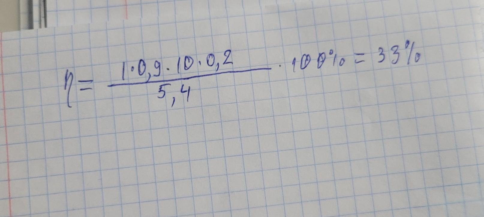 Школьник, перемещая равномерно по наклонной доске груз массой 1 кг, приложил силу 5,4 Н. Каково значение КПД конструкции, если длина доски 0,9 м и высота над горизонтальным уровнем 0,2 м? (Принять g≈10Нкг).