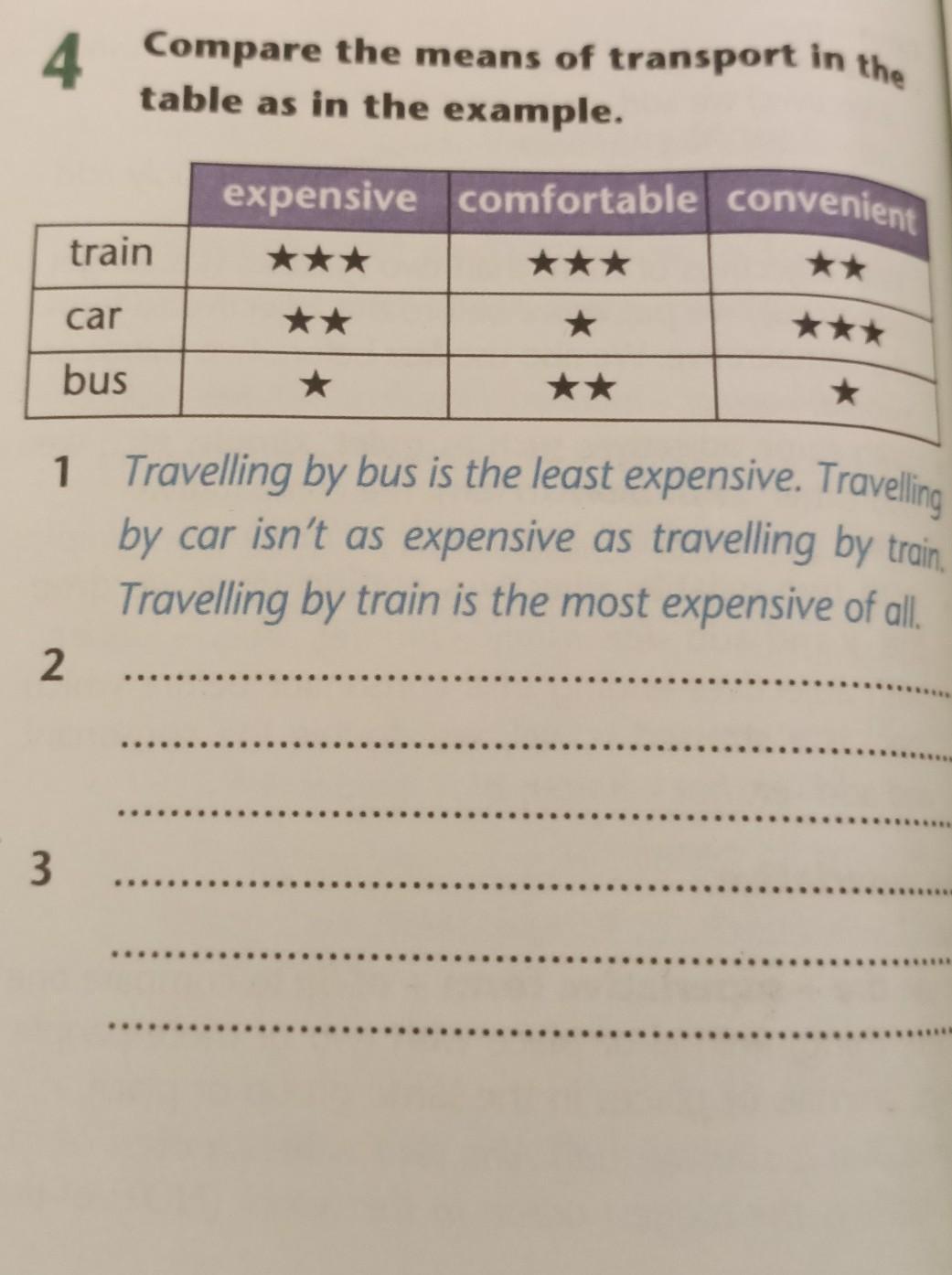 4 Compare the means of transport in the table as in the example. train car bus 2 expensive ★★★ ★★ ★ the 3 comfortable convenient ★★★ ★★ ★★★ ★ 1 Travelling by bus is the least expensive. Travelling by car isn't as expensive as travelling by train. Travelling by train is the most expensive of all. ★★