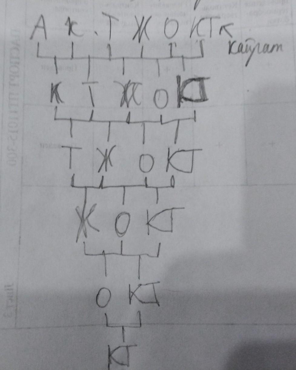 в футбольном турнире участвует 6 команд: Астана, Кайсар, Тобол, Жетысу, Ордабасы и Кайрат. В этом турнире каждая команда должна сыграть с каждой ровн по одному разу. На данный момент Астана сынграла турнире один матч, Кайсар - 2 матча, Тобол - 3 матч Жетысу - четыре матча, Ордабасы - 5 матчей. Сколь матчей на данный момент сыграл Кайрат? -