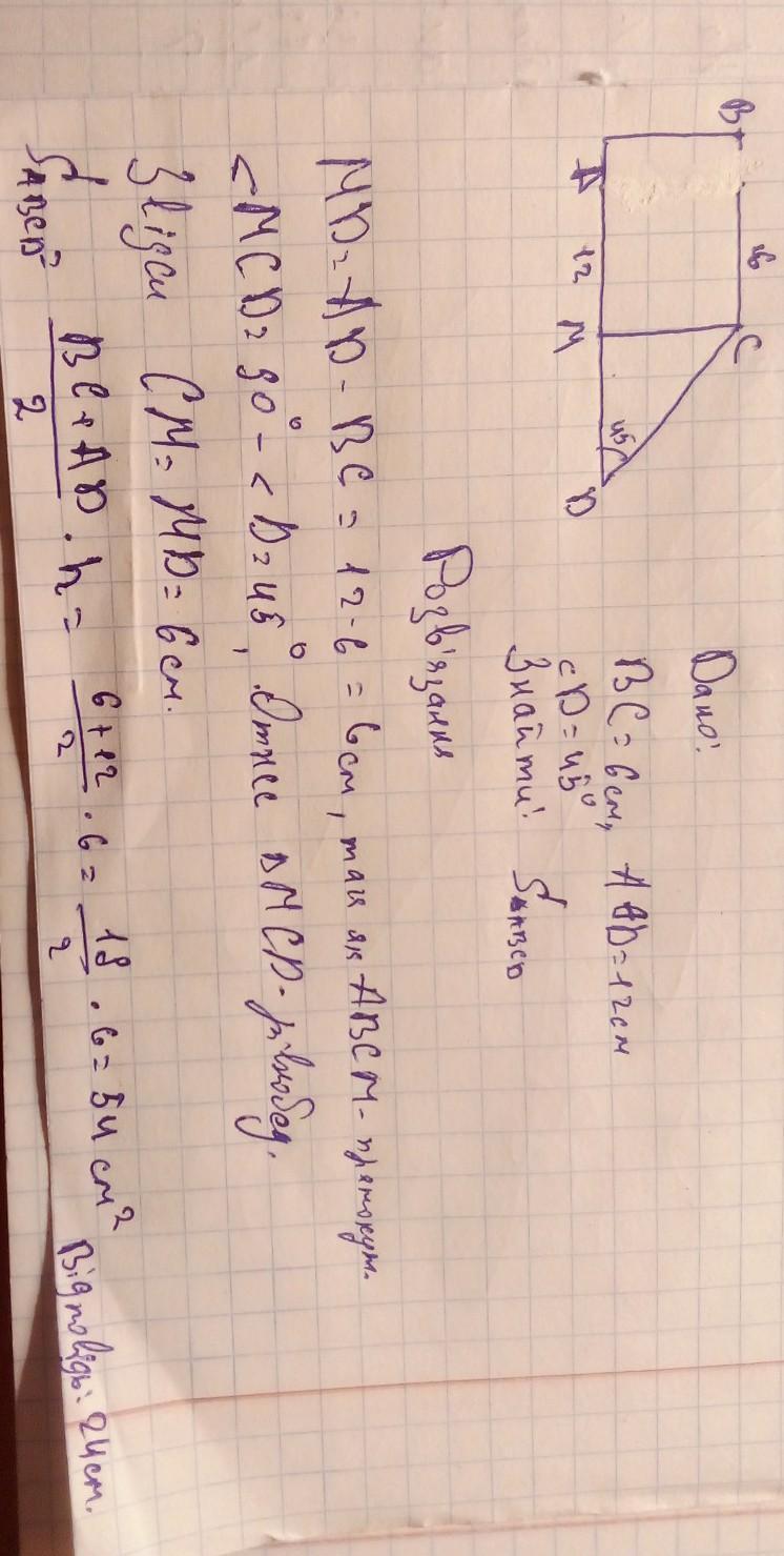 4. Один із кутів прямокутної трапеції дорівнює 45°. Обчисліть площу даної трапеції, якщо її основи дорівнюють: 6 см і 12 см