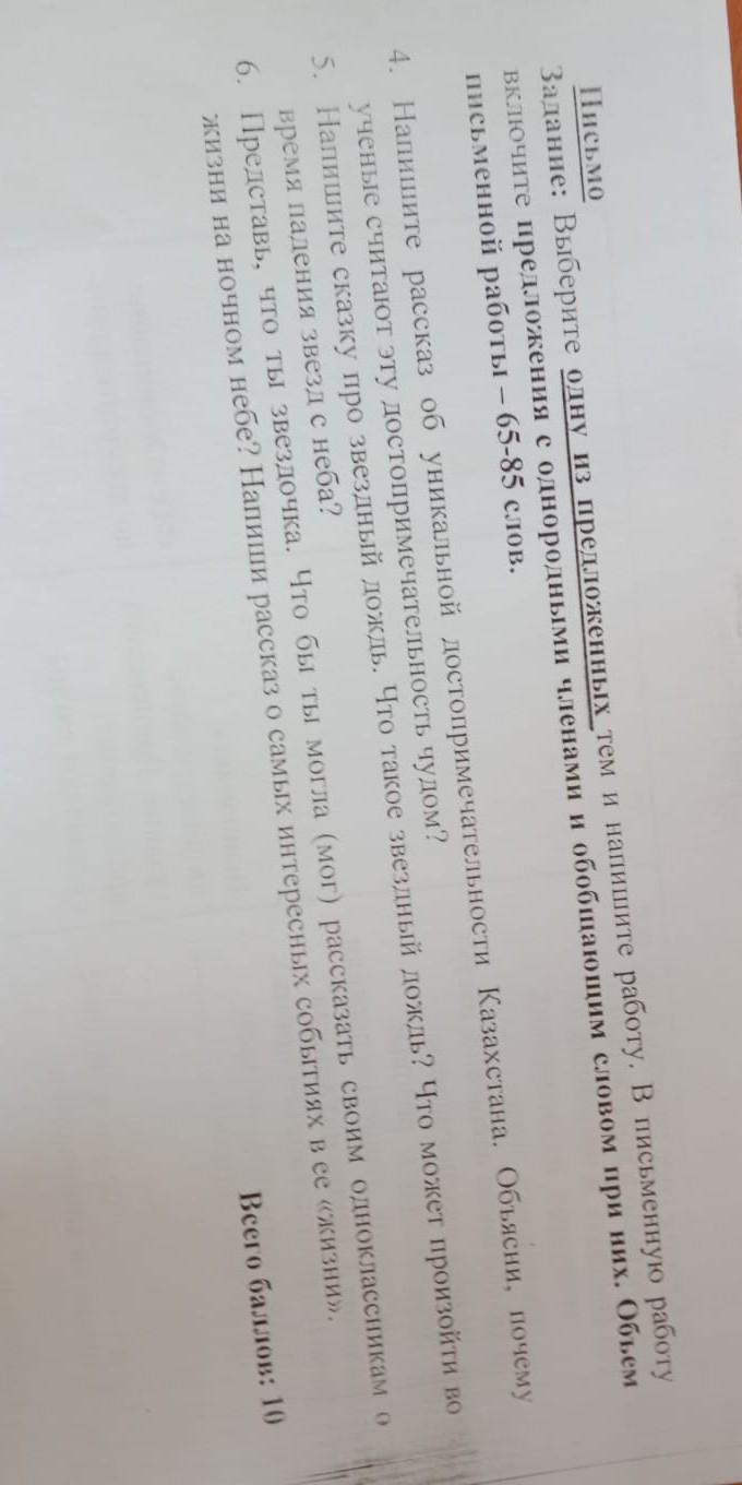 ПИСЬМО Задание: Выберите одну из предложенных тем и напишите работу. В письменную работу включите предложения с однородными членами и обобщающим словом при них. Объем письменной работы - 65-85 слов. 4. Напишите рассказ об уникальной достопримечательности Казахстана. Обьясни, почему ученые считают эту достопримечательность чудом? 5. Напишите сказку про звездный дождь. Что такое звездный дождь? Что может произойти во 6. время падения звезд с неба? Представь, что ты звездочка. Что бы ты могла (мог) рассказать своим одноклассникам о жизни на ночном небе? Напиши рассказ о самых интересных событиях в ее «жизни». Всего баллов: 10
