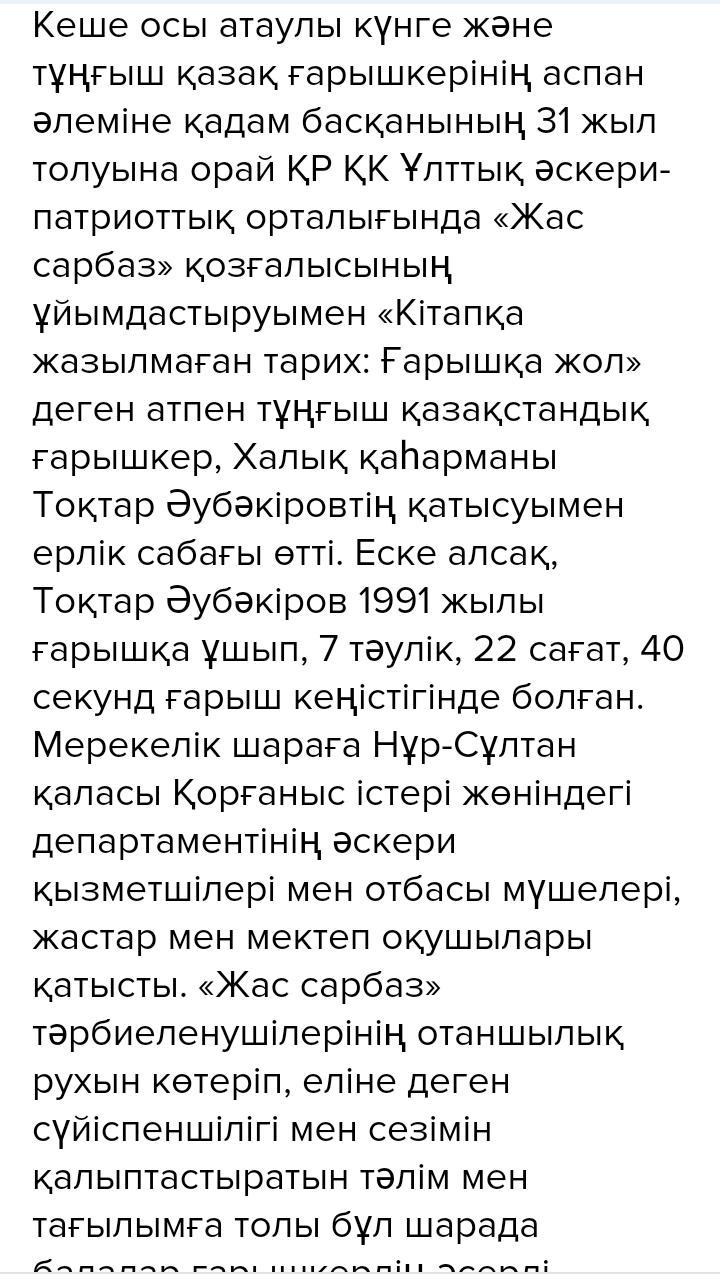 Подготовить статью или интервью по данным темам, используя сложно-сочиненные предложения (2-3) 75-80 слов. Выбираете одну из этих тем: 1. Ғарышқа жол ашқан қазақ батырлары/казахские путь в кОСМОС. герои, которые открыли