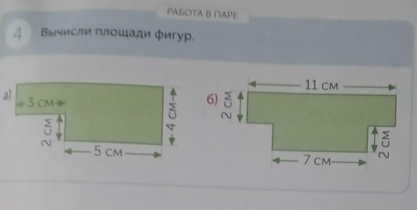 4 Вычисли площади фигур. 3 см+ CM N РАБОТА В ПАРЕ -5 см- 4 см- 6) б - 11 см 7 см 2 см Б 55 балов дам