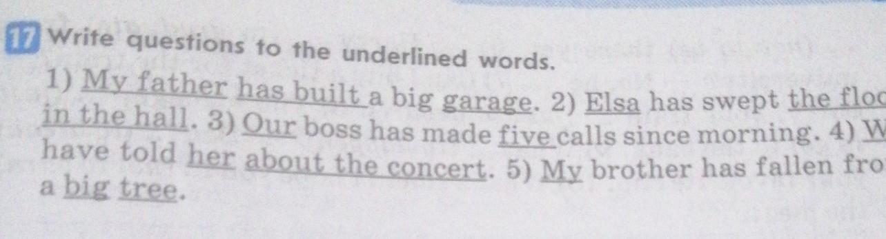 The Verb 17 Write questions to the underlined words. 1) My father has built a big garage. 2) Elsa has swept the floor in the hall. 3) Our boss has made five calls since morning. 4) We have told her about the concert. 5) My brother has fallen from a big tree.