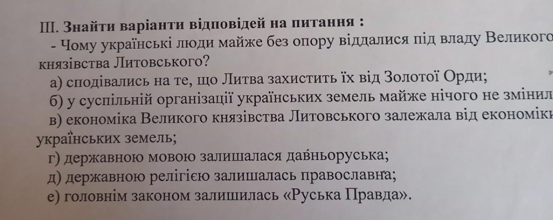 Знайти варіанти відповідей на питання : - Чому українські люди майже без опору віддалися під владу Великого князівства Литовського, а) сподівались на те, що Литва захистить їх від Золотої Орди; б) у суспільній організації українських земель майже нічого не змінил в) економіка Великого князівства Литовського залежала від економіки українських земель; г) державною мовою залишалася давньоруська; д) державною релігією залишалась православна; e) головнім законом залишилась «Руська Правда».