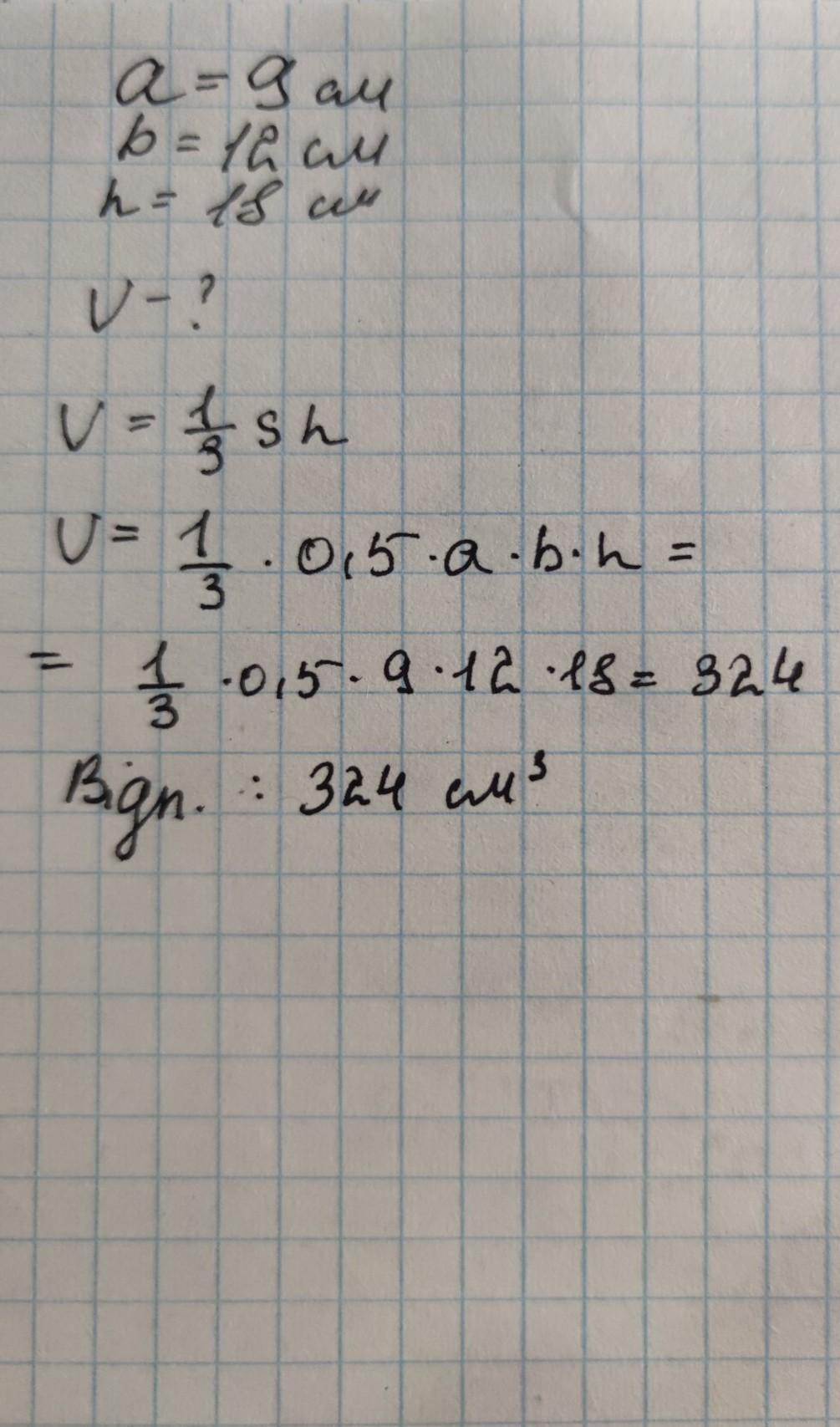 Основою піраміди є прямокутний трикутник з катетами 9 см і 12 см та висотою 18 см. Знайти об'єм даної піраміди.