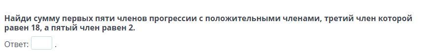 Найди сумму первых пяти членов прогрессии с положительными членами, третий член которой равен 18, а пятый член равен 2.
