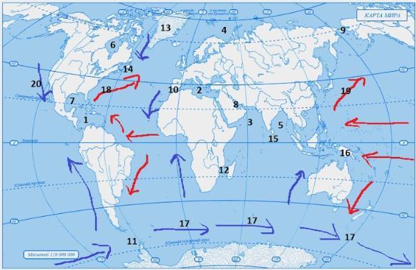 17 - течія західних вітрів; 18 - течія Гольфстрім; 19 - течія Куросіо; 20 - Каліфорнійська течія