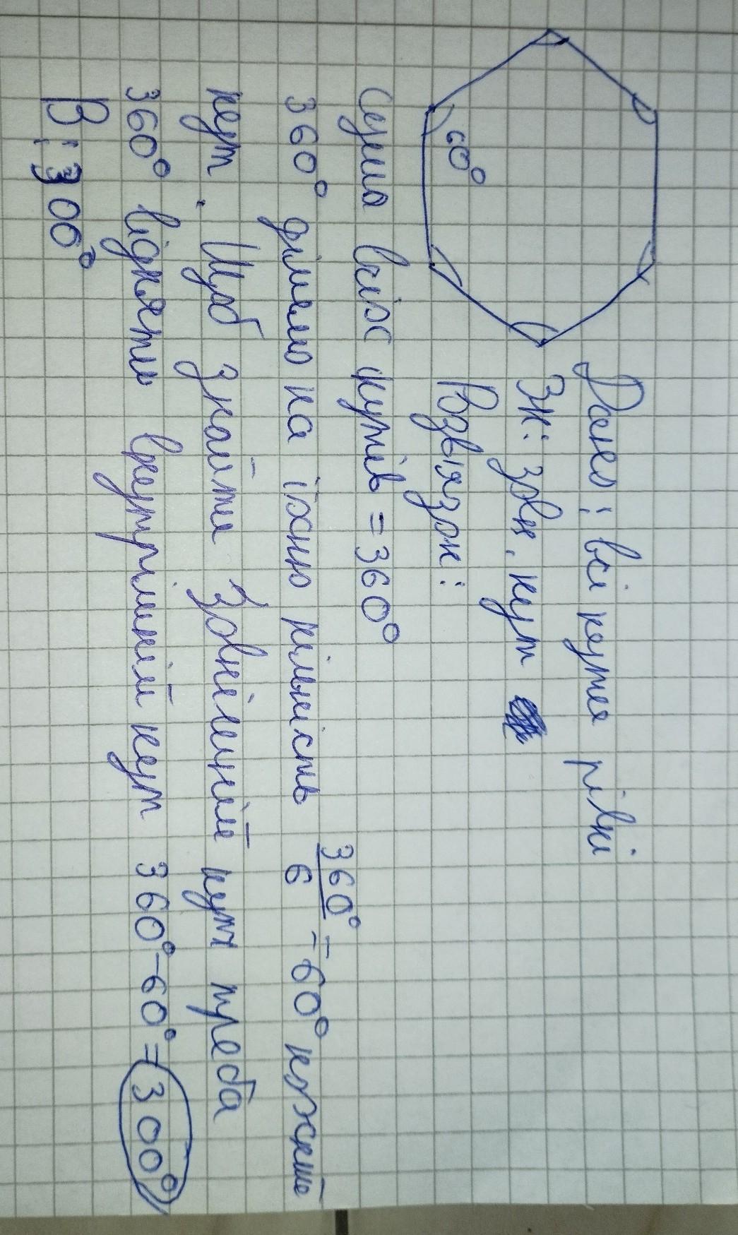 Внутрішній кут = 180 градусів / 6 = 30 градусів.