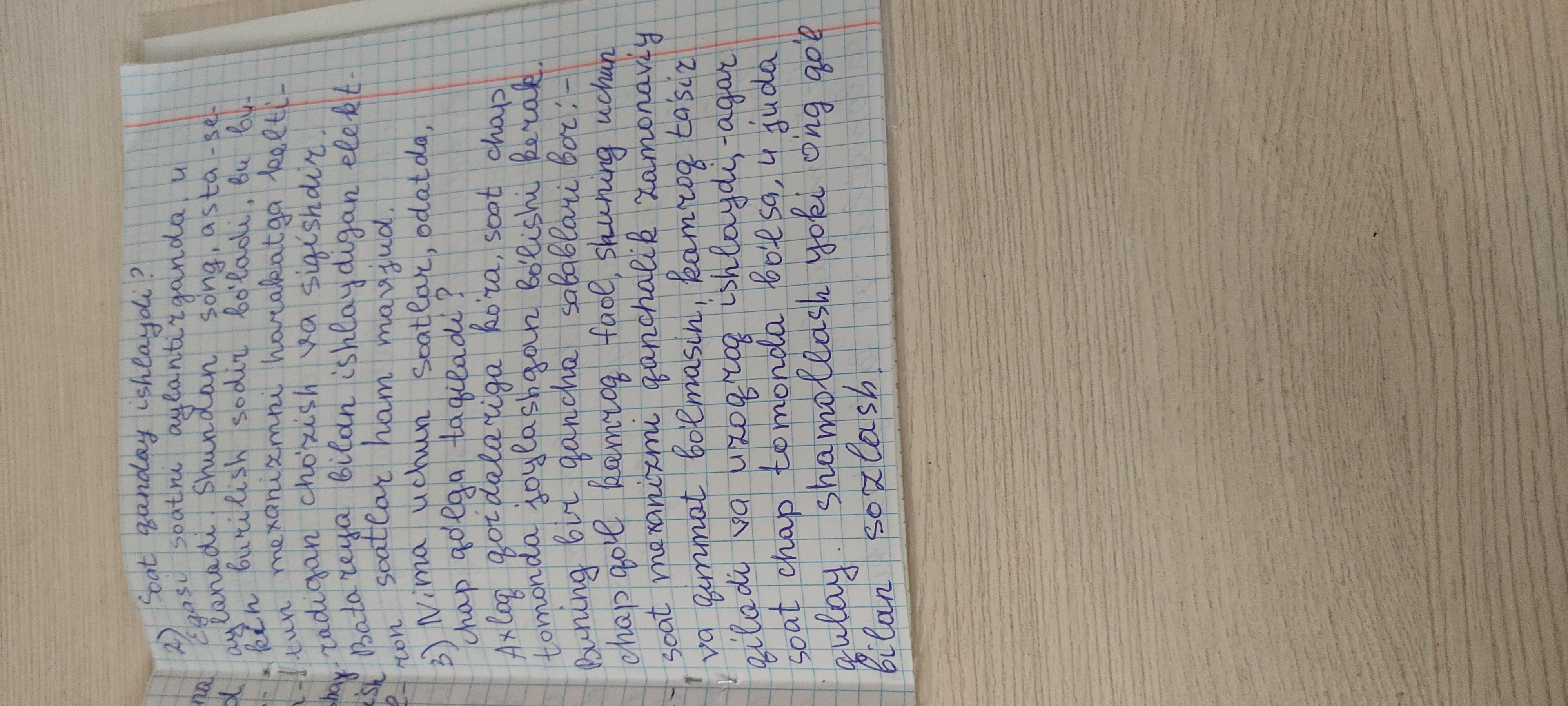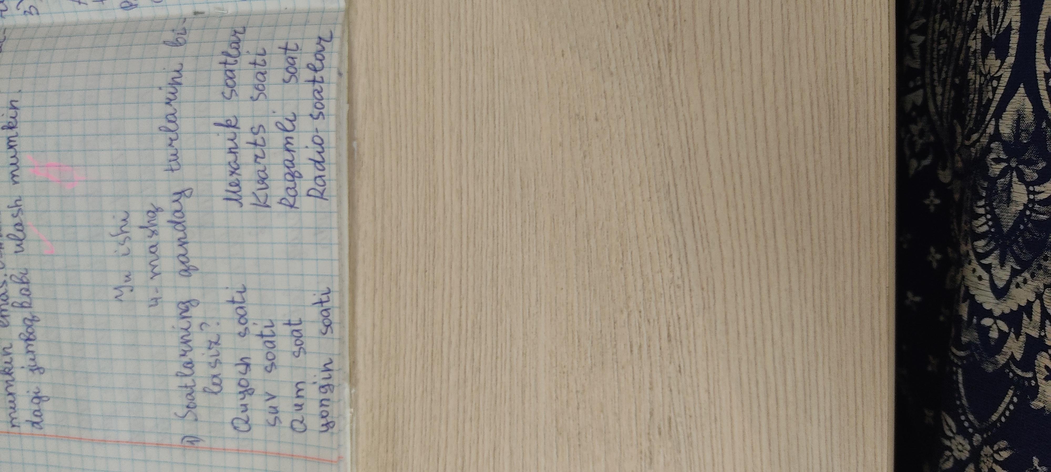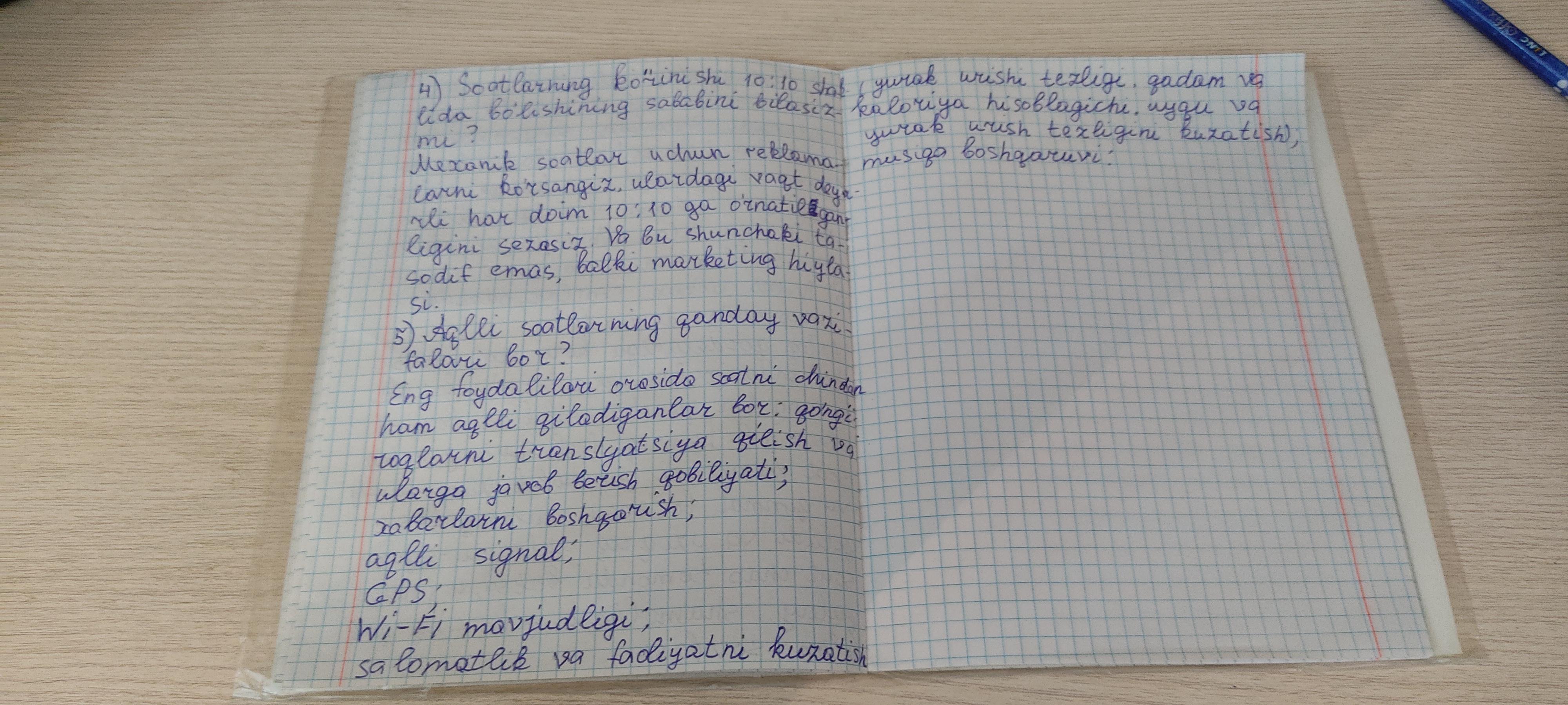 1. Soatlarning qanday turlarini bilasiz? 2. Soat qanday ishlaydi? 3. Nima uchun soatlar, odatda, chap qoʻlga taqiladi? 4. Soatlarning ko'rinishi 10:10 shaklida bo'lishining sababini bilasizmi? 5. Aqlli soatlarning qanday vazifalari bor?