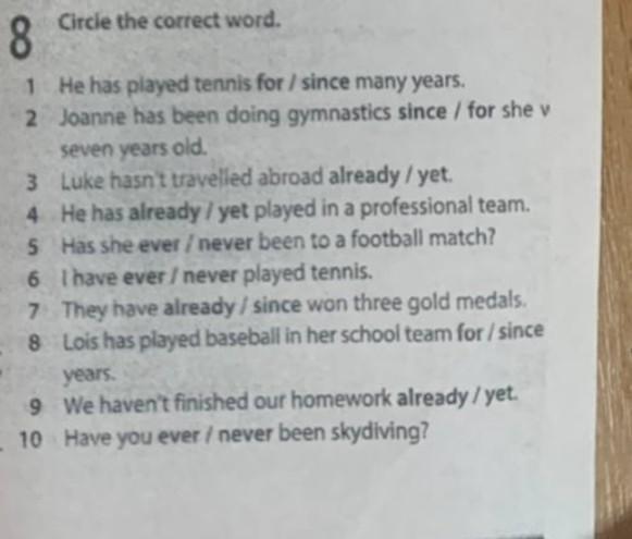 2 Joanne has been doing gymnastics since / for she v seven years old.