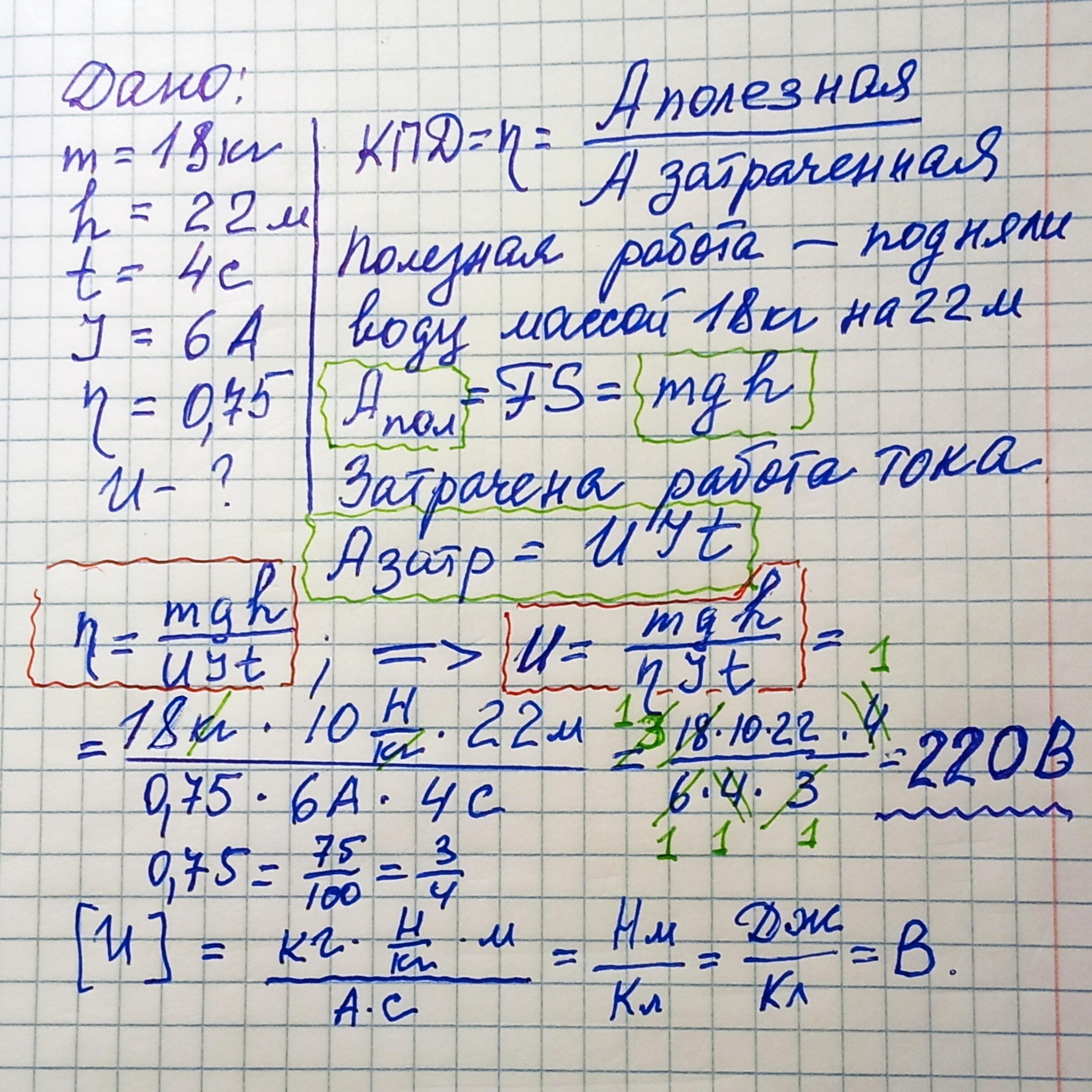 За 4 с.насос піднімає 18 л. води з глибини 22 м.Визначте напругу в мережі,від якої живиться двигун насоса,якщо сила струму в обмотці двигуна дорівнює 6 А,а ККД двигуна - 75 відсотків