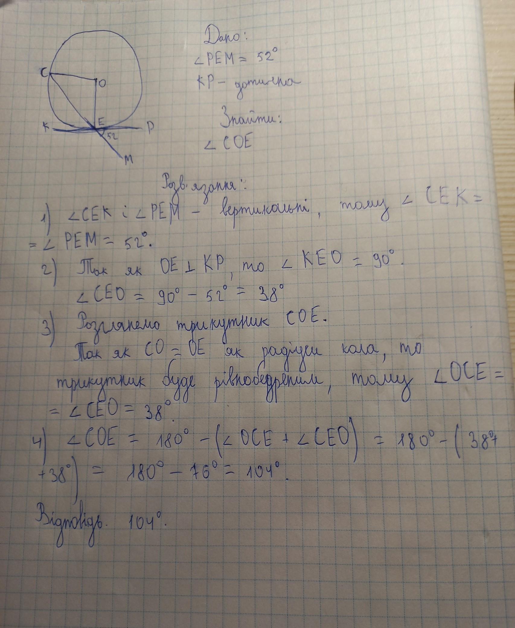 На рисунку KP — дотична до кола із центром О у точці дотику Е. Знайдіть кут COE, якщо кут EP = 52°