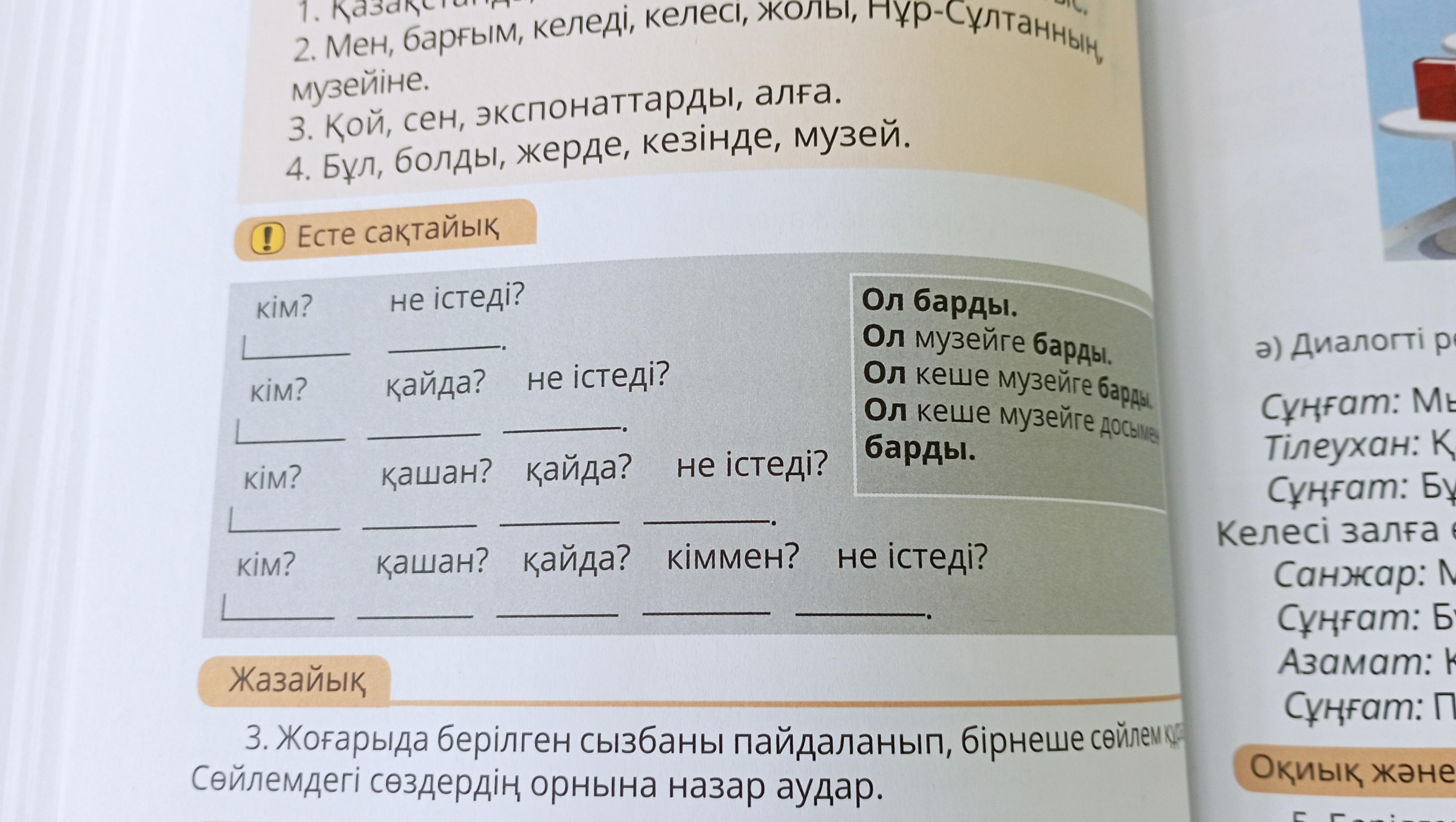 кім?- бала не итейды-барды ол кайда барды?- ол музейге барды. ол кашан барды?- ол кеше барды. ол кіммен барды? ол досыммен барды