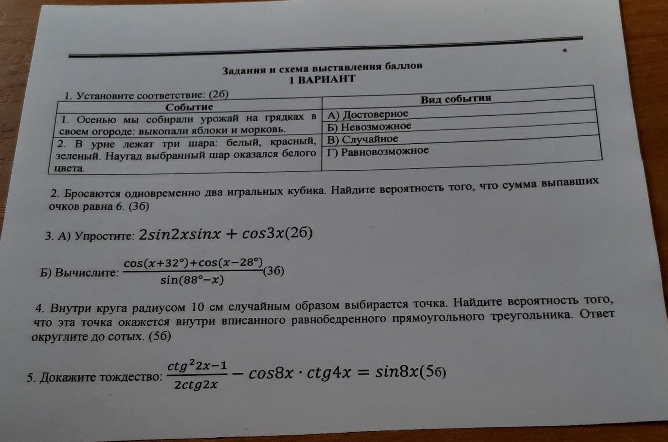 1. Установите соответствие: (26) Событие 1. Осенью мы собирали урожай на грядках в своем огороде: выкопали яблоки и морковь. A) Достоверное Б) Невозможное в) Случайное 2. В урне лежат три шара: белый, красный, зеленый. Наугад выбранный шар оказался белого Г) Равновозможное цвета. Задания и схема выставления баллов 1 ВАРИАНТ Б) Вычислите: 2. Бросаются одновременно два игральных кубика. Найдите вероятность того, что сумма выпавших очков равна 6. (36) 3. А) Упростите: 2sin2xsinx + cos3x(26) cos(x+32°)+cos(x-28°) sin(88°−x) 5. Докажите тождество: 4. Внутри круга радиусом 10 см случайным образом выбирается точка. Найдите вероятность того, что эта точка окажется внутри вписанного равнобедренного прямоугольного треугольника. Ответ округлите до сотых. (56) ctg22x-1 2ctg2x Вид события (36) - cos8x. ctg4x = sin8x(56)