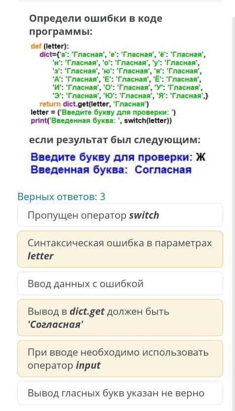 СРОЧНО ДОСТАР!Определи ошибки в коде программы: def (letter): dict={'a': 'Гласная', 'е': 'Гласная", "ё": "Гласная", и': 'Гласная', 'o': 'Гласная', 'у': 'Гласная', 'з': 'Гласная', 'ю': 'Гласная', 'я': 'Гласная', 'А': 'Гласная', 'E': 'Гласная', 'Ё': 'Гласная', "И": 'Гласная', 'О': 'Гласная", "У": "Гласная", 'З': 'Гласная', 'Ю: 'Гласная', 'Я': 'Гласная',} return dict.get(letter, 'Гласная") letter = ('Введите букву для проверки: ') print('Введенная буква: ', switch(letter)) если результат был следующим: Введите букву для проверки: Ж Введенная буква: Согласная Верных ответов: 3 Пропущен оператор switch Синтаксическая ошибка в параметрах letter Ввод данных с ошибкой Вывод в dict.get должен быть 'Согласная' При вводе необходимо использовать оператор input Вывод гласных букв указан не верно