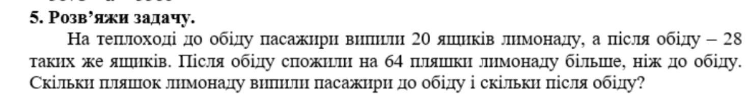 На теплоходе до обеда пассажиры випили 20 ящиков лимонада, а после обеда - 28 таких же ящиков. После Обеда Они Использовали на 64 бутылки лимонада больше, чем до обеда. Сколько бутылок лимонада випили пассажиры до обеда и сколько после обеда?