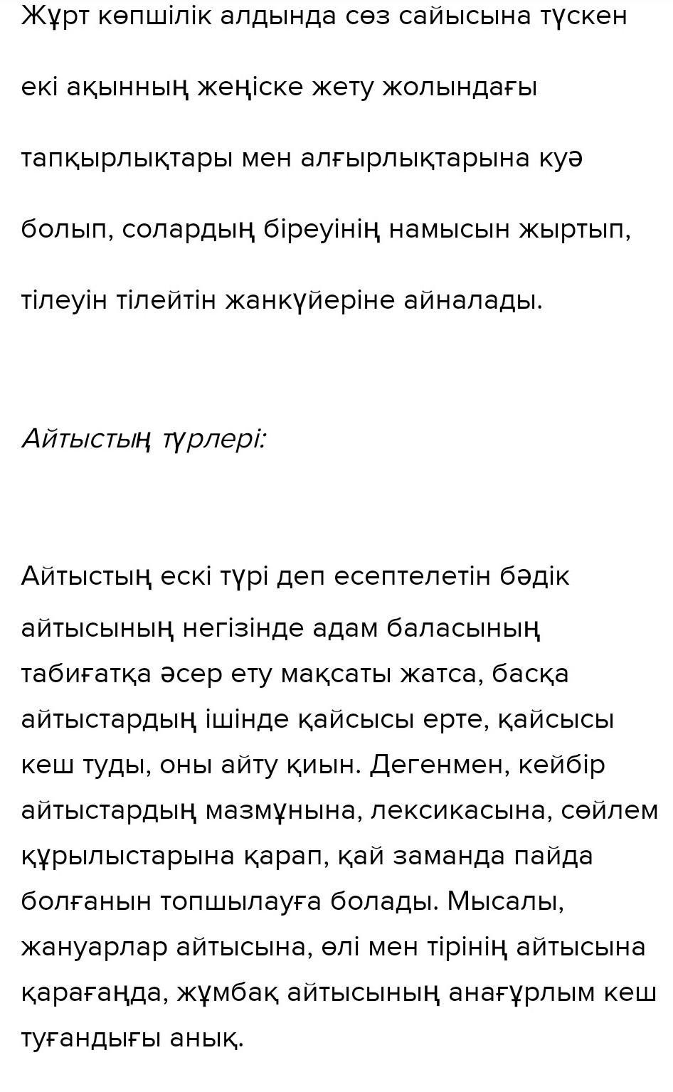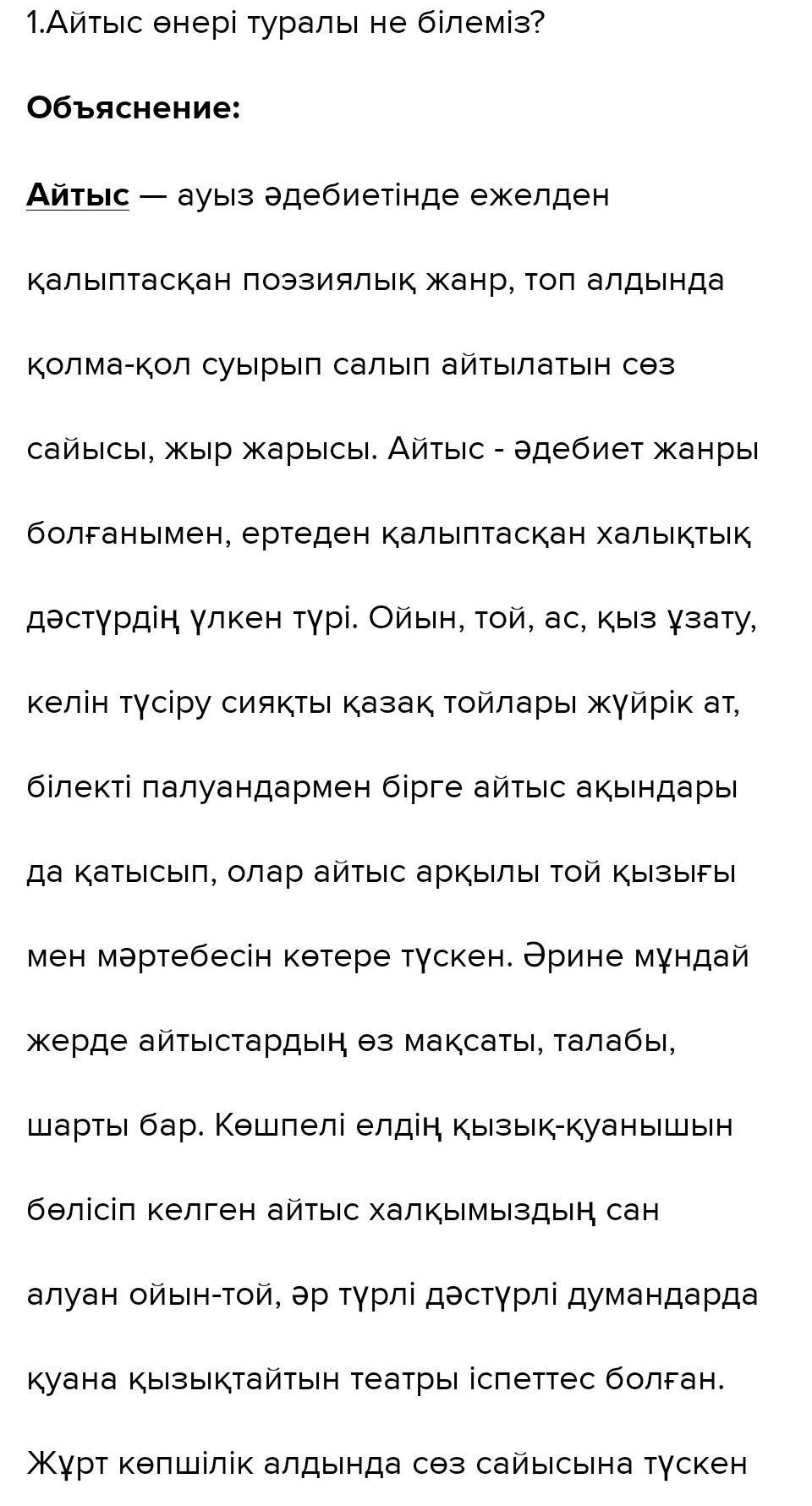 Айтылым Бір тақырыпқа таңдау жасап, сол тақырып бойынша монолог дайынданыз (8-10 сөйлем). Баяндауда сөйлеу мәнiрiнiзге көңіл бөліңіз. Сөздерді орфоэпиялык норма мен үндестік зандарына сай айтуға тырысыңыз 1. Айтыс өнерінің кешегісі мен бүгіні 2.Байконыр айлағына мен де улесiмдi коскым келеді 3. Мен үшін Мәңгілік елдің нұрлы жолының маңызы [10]