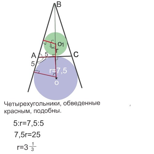 Основание АС равнобедренного треугольника АВС равно 10. Окружность радиуса 7,5 с центром вне этого треугольника касается продолжений боковых сторон треугольника и касается основания АС в его середине. Найти радиус окружности,вписанной в треугольник АВС