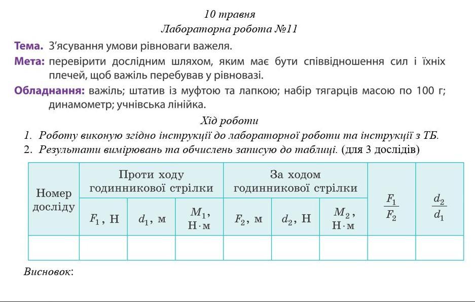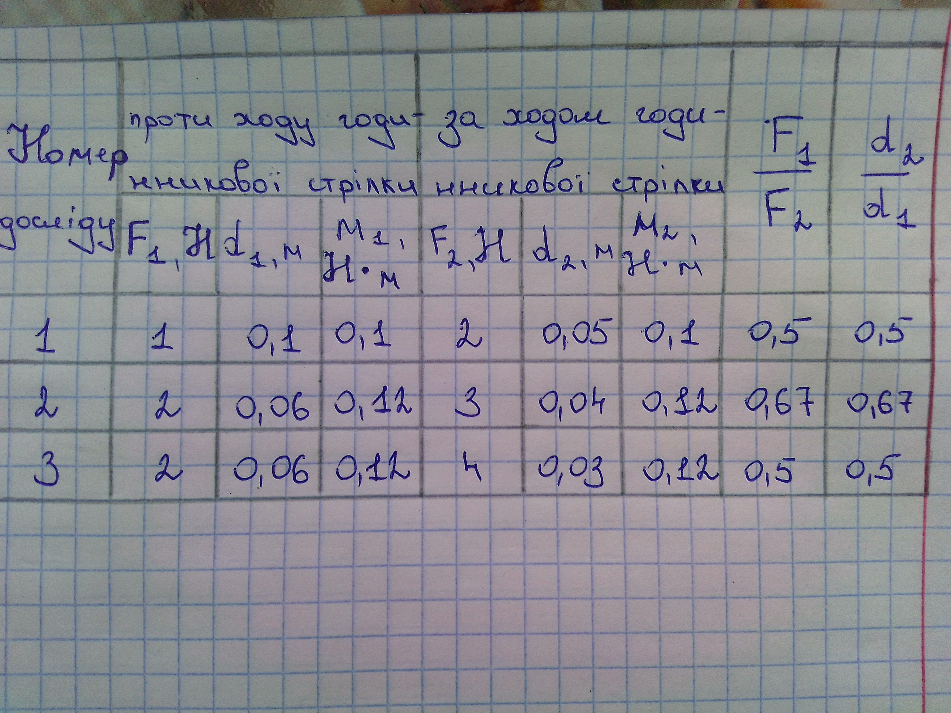 Висновок: На лабораторій роботі ми познайомилися з важелем та встановили умови його рівноваги. Важіль знаходиться в рівновазі, якщо момент сил який обертає важіль за годинниковою стрілкою дорівнює моменту сил, що обертає важіль проти годинникової стрілки. На точність вимірювань вплинули ціна поділки приборів, та точність вимірювання.