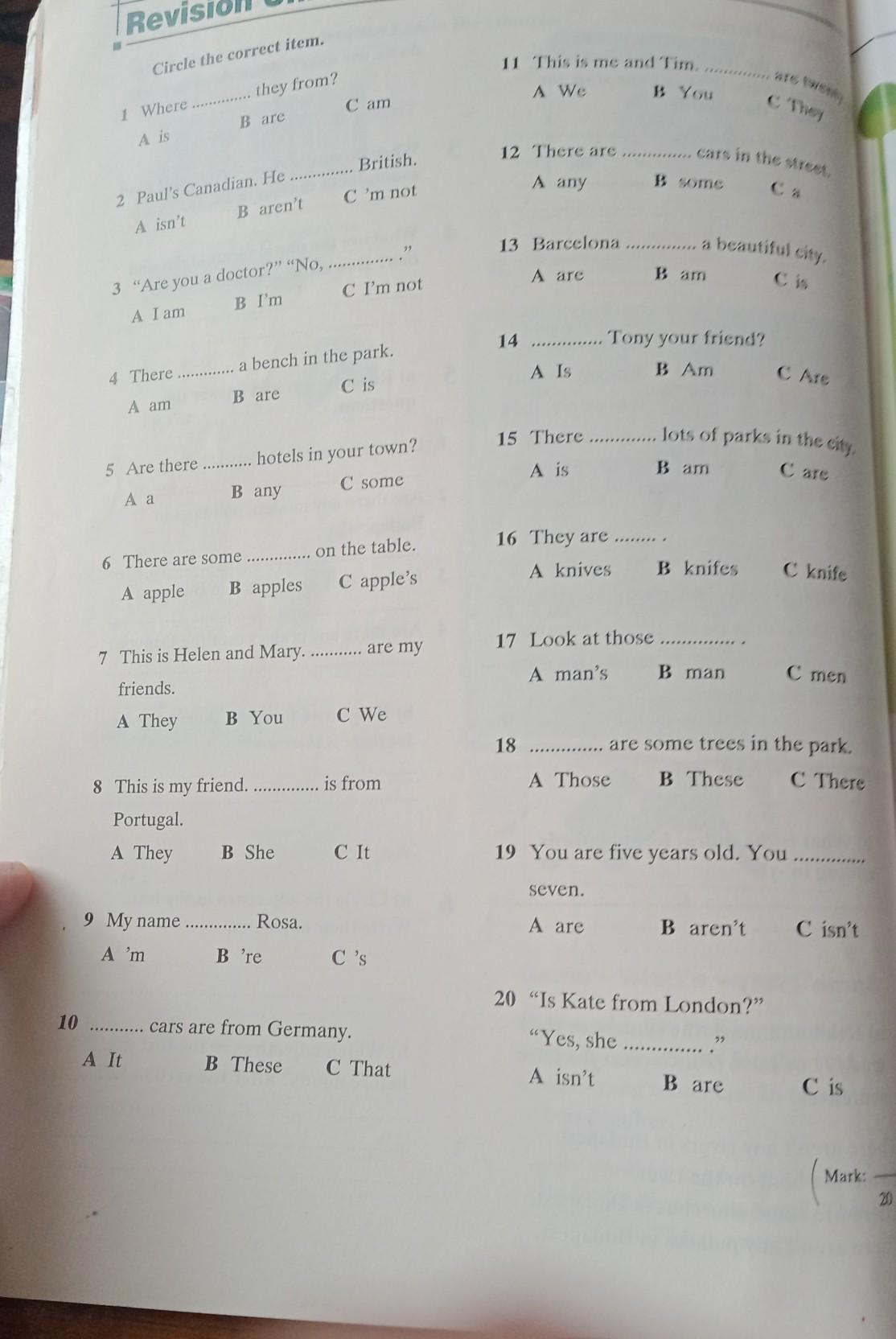 1 Where 2 Paul's Canadian He B aren't Bare 3 "Are you a doctor?" "No, 4 There. a bench in the park. Bare C is $ Are there hotels in your town? C some Bany 6 There are some.............. A apple B apples 9 My name. British. C'm not C I'm not 8 This is my friend.... Portugal. A They 7 This is Helen and Mary. friends. A They B You C We on the table. C apple's ... are my Rosa. ..... is from B She C It 10 cars are from Germany. B These C That A We 12 There are A any 13 Barcelona A are 14 A Is 15 There A is 16 They are A knives 17 Look at those A man's B You seven. A are cars in the street Ca B some a beautiful city. C is B am Tony your friend? B Am B knifes are twenty C They lots of parks in the city C are B am B man C Are 18 ...............are some trees in the park. A Those B These C There 19 You are five years old. You. 20 "Is Kate from London?" "Yes, she A isn't C knife B are C men B aren't C isn't C is Mark 1 2 3