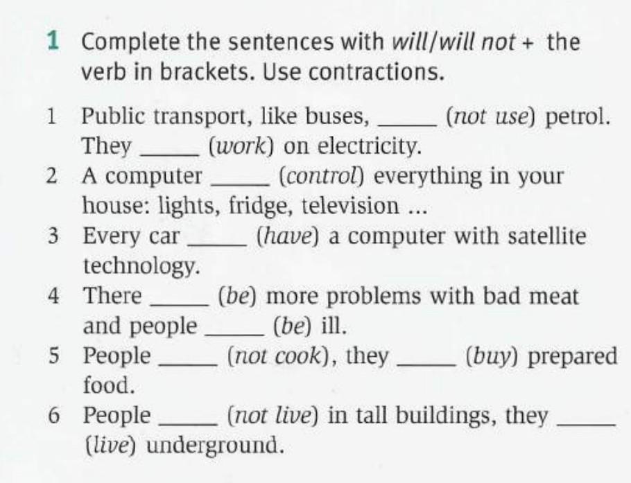 Complete the sentences with will/will not + the verb in brackets. Use contractions.