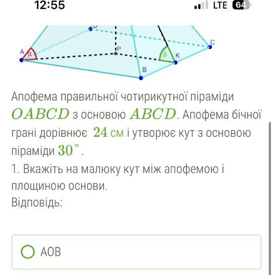 авильної чотирикутної піраміди OABCD з основою ABCD. Апофема бічної грані дорівнює 24 см і утворює кут з основою піраміди 30°.