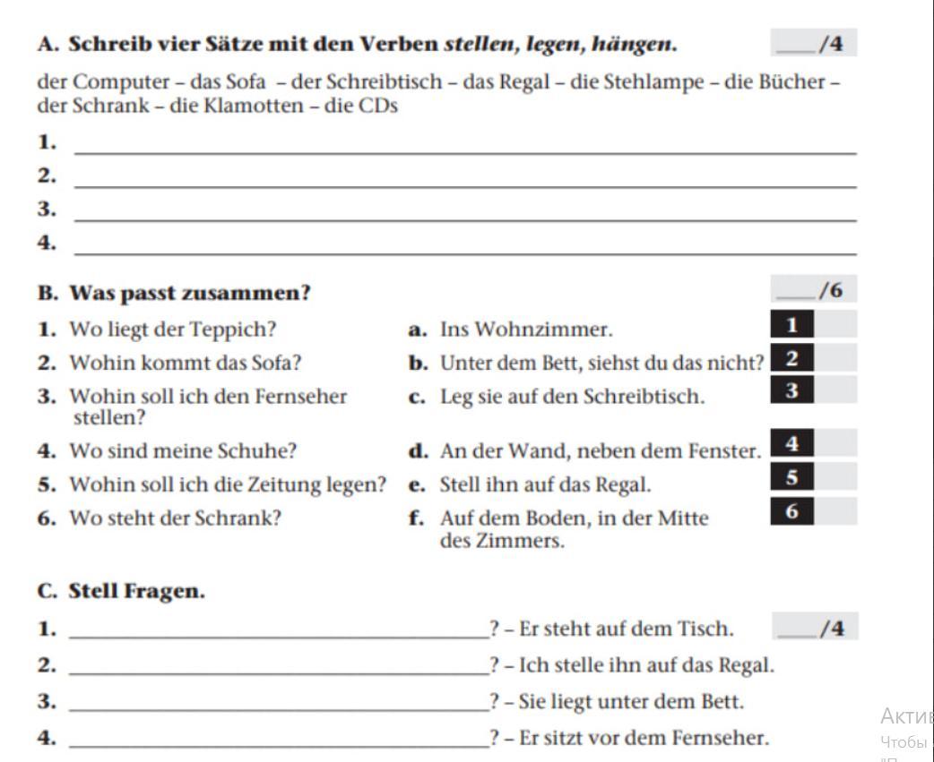 A. Schreib vier Sätze mit den Verben stellen, legen, hängen.