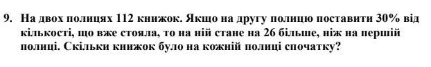 Нехай на I полиці було х книжок, тоді на ІІ полиці було 112- х книжок. Коли на II полицю поставили 30% від кількості, що вже була на ній, то на ній стало 1,3(112 - x) книжок, що на 26 більше ніж на 1 полиці. Складаємо рівняння.