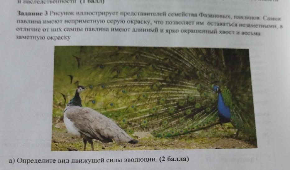Рисунок иллюстрирует представителей семейства фазановых, павлинов. Самки павлина имеют неприметную серую окраску, что позволяет им оставаться незаметными, в отличии от них самцы павлина имеют длинный и ярко окрашенный хвост и весьма заметную окраску. (а) Определите вид движущей силы эволюции