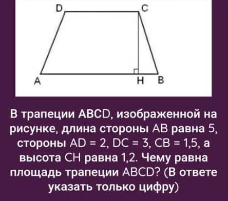 В трапеции ABCD, изображенной на рисунке, длина стороны АВ равна 5, стороны AD = 2, DC = 3, CB = 1,5, а высота сн равна 1,2. Чему равна площадь трапеции ABCD? (В ответе указать только цифру)