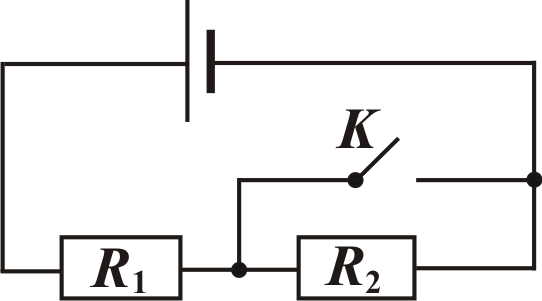 В цепи мощность тока одинакова при замкнутом и разомкнутом ключе К. Определите внутреннее сопротивление r источника тока, если R1=4 Ом, R2=5 Ом.