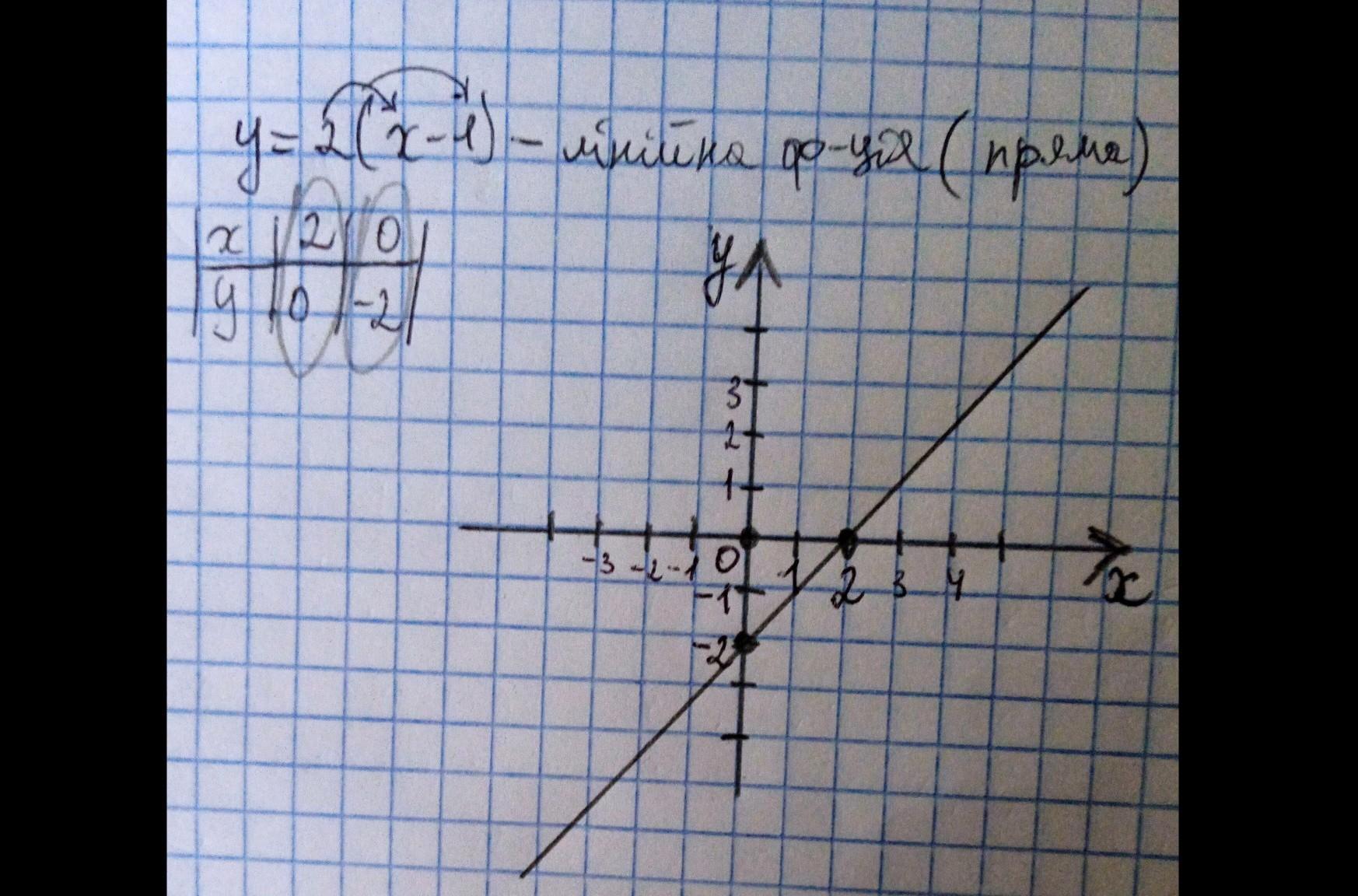 Побудувати графік функції y=2(x-1). Знайти координати точок, в яких цей графік перетинається з осями координат.